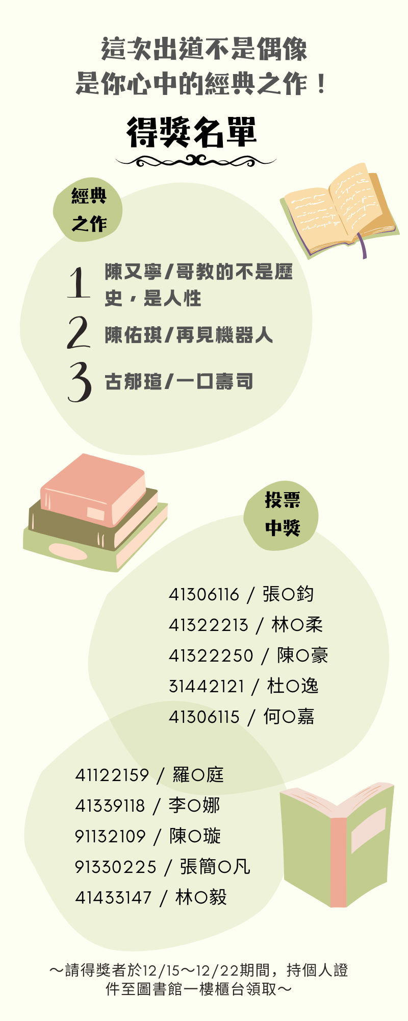 請三位得獎者,盡可能於114/12/15(一)中午12:00前撥空至圖書館一樓櫃台簽名,