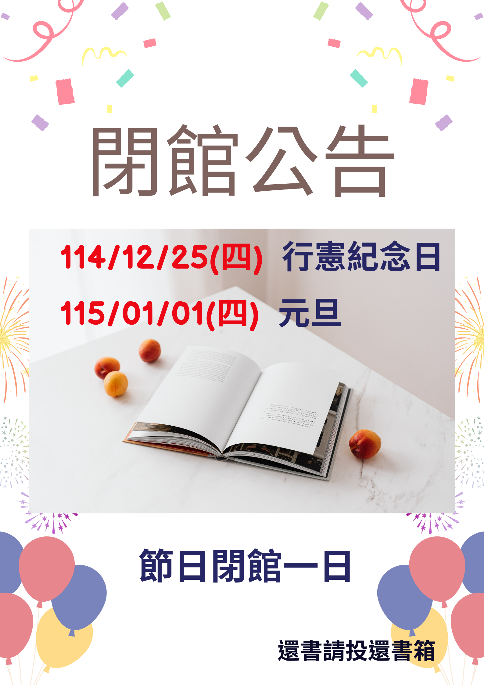 [閉館公告] 行憲紀念日114/12/25(四) 及 元旦115/1/1(四), 假日當天閉館, 還書請投還書箱。