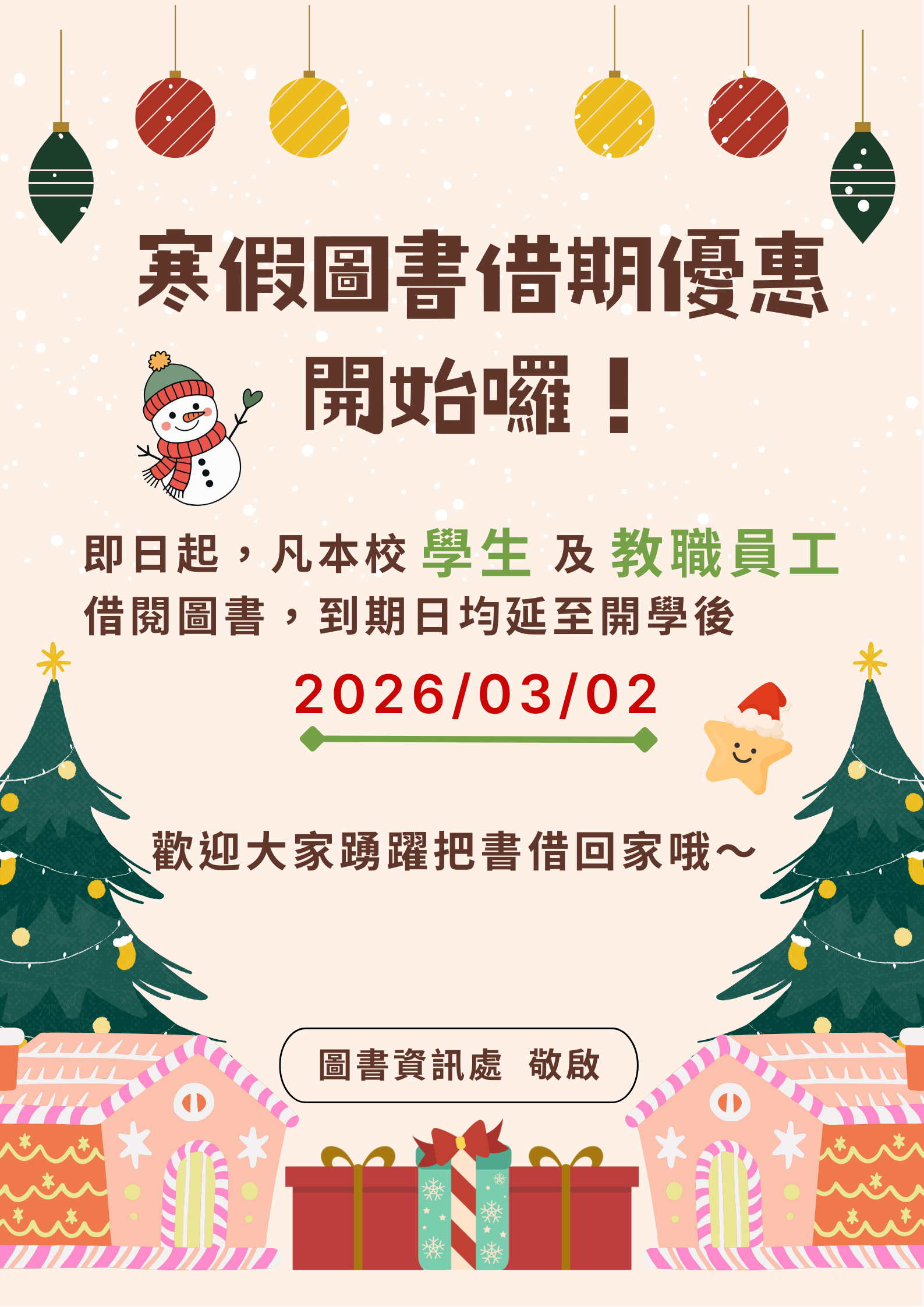 【寒假圖書借期優惠】即日起,凡本校「學生」及「教職員工」借閱『圖書』,到期日均延至開學後 2026/3/2(一)歸還,請本校師生踴躍借用圖書。