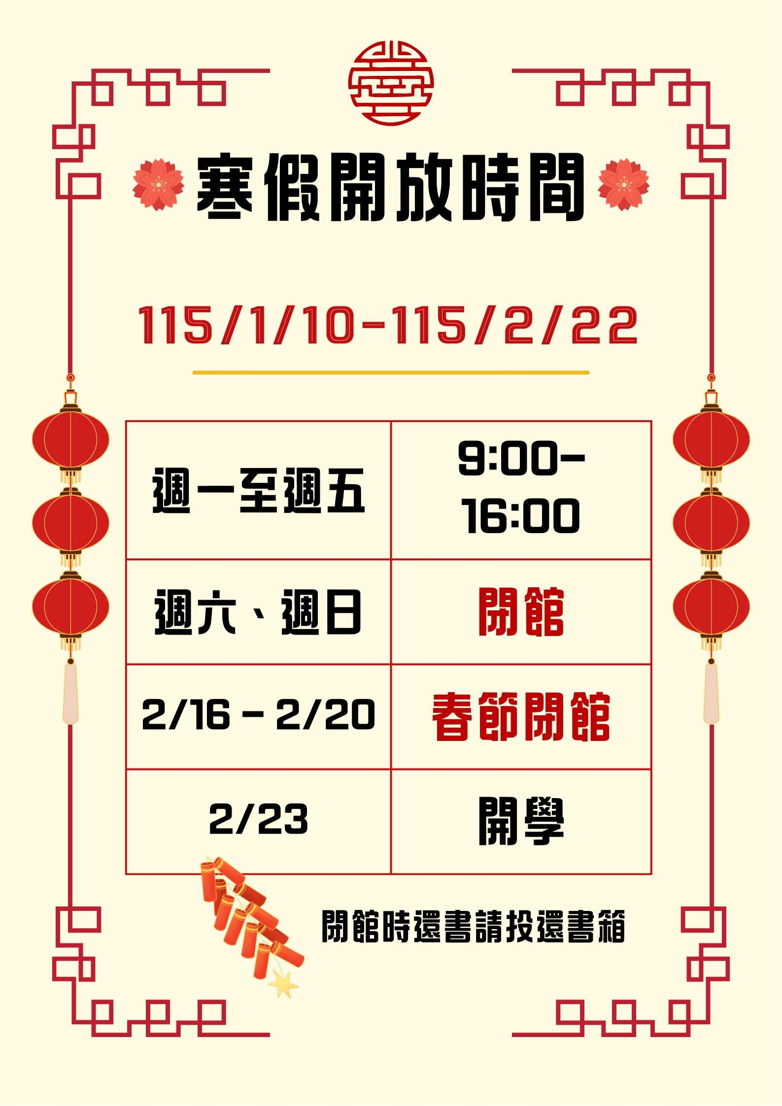 [寒假開放時間]115/1/10~115/2/22為寒假期間,開放時間與平日不同,請多加留意。