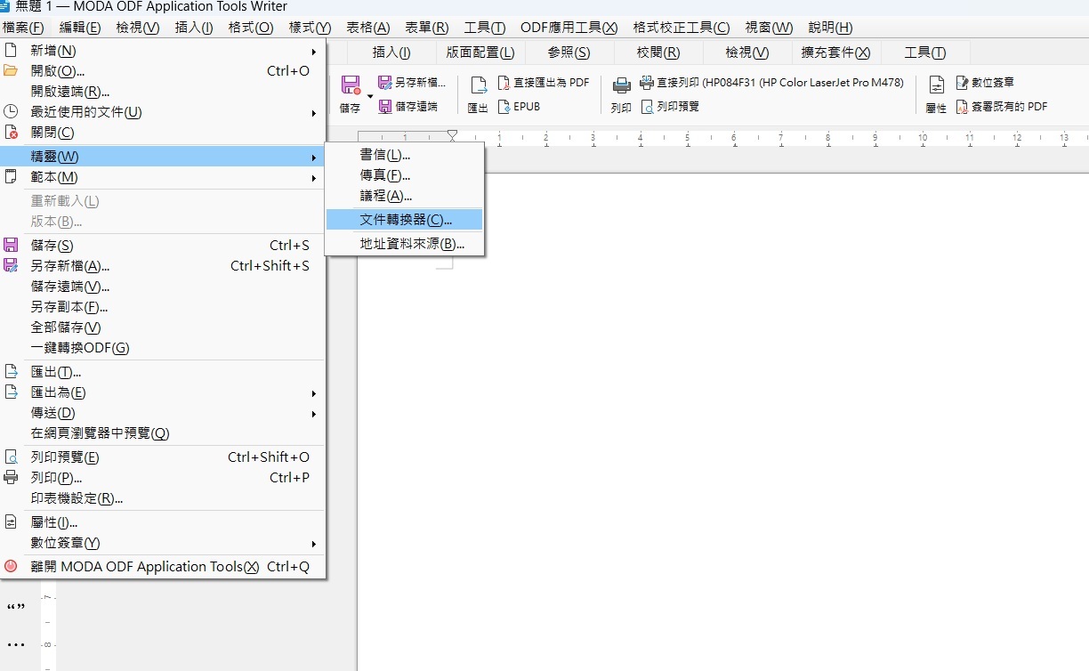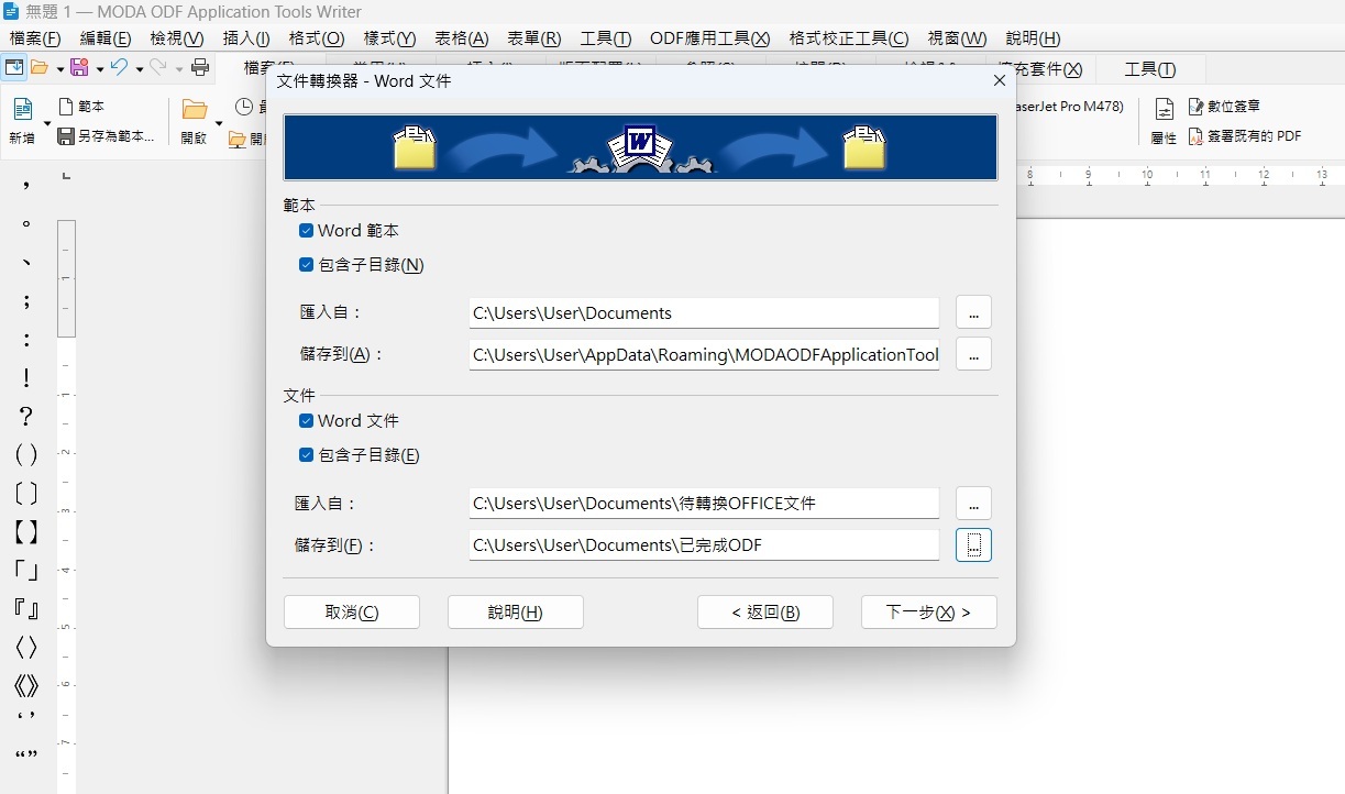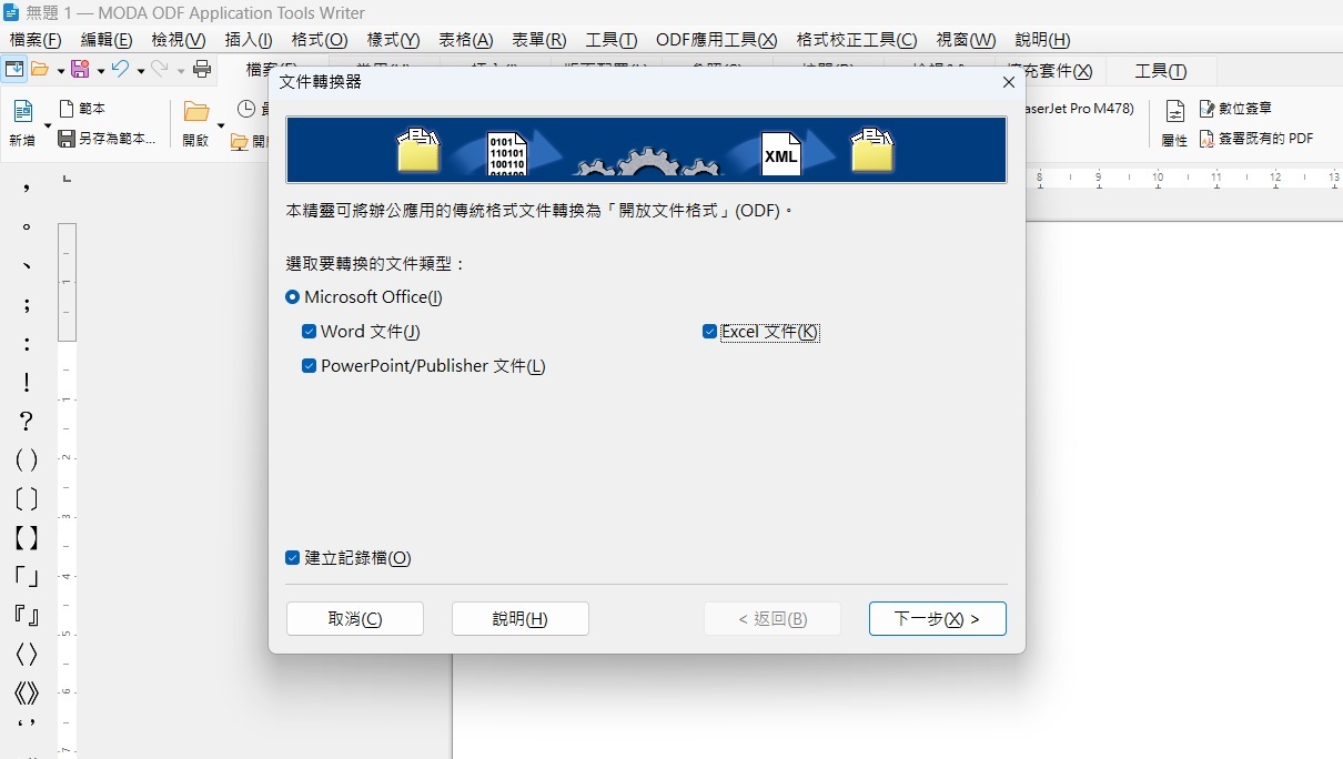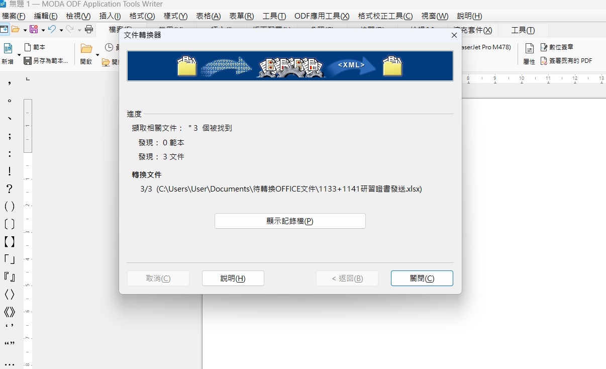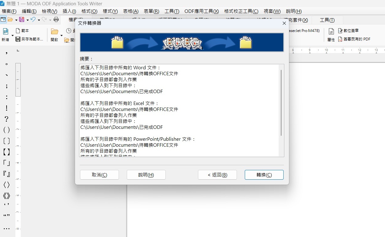 可分為批次轉檔與轉成ODF兩種,轉換成ODF後若發現異常,請重回OFFICE原始文件中移除或調整格式,再重新輸出ODF檔案。